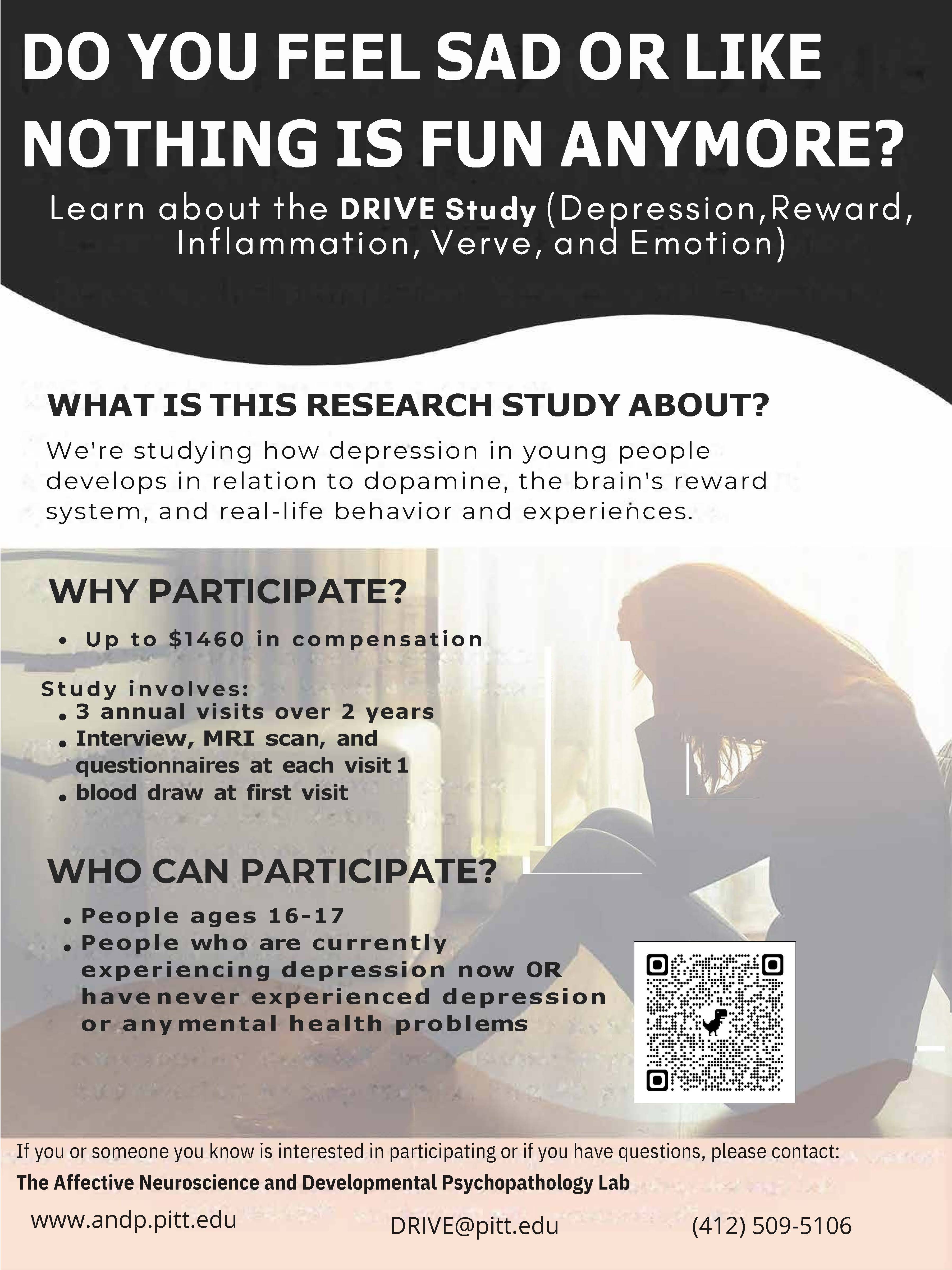 The goal of the DRIVE Study is to understand the role of the brain’s dopamine system and reward system in depression in young people over time. The study will also examine how inflammation could influence depression through these brain systems. To do this, the study will include both young people with depression and young people with no history of mental health problems. By helping to understand the brain systems of depression, this study could, in the long term, eventually help develop treatments for people with depression. The DRIVE Study includes three visits over approximately two years. If you participate, you will complete an interview, MRI scan, behavioral tasks, questionnaires, and app-based assessment of experiences and behaviors at each visit. You will also have a blood draw at the first visit. Learn more through Pitt+Me